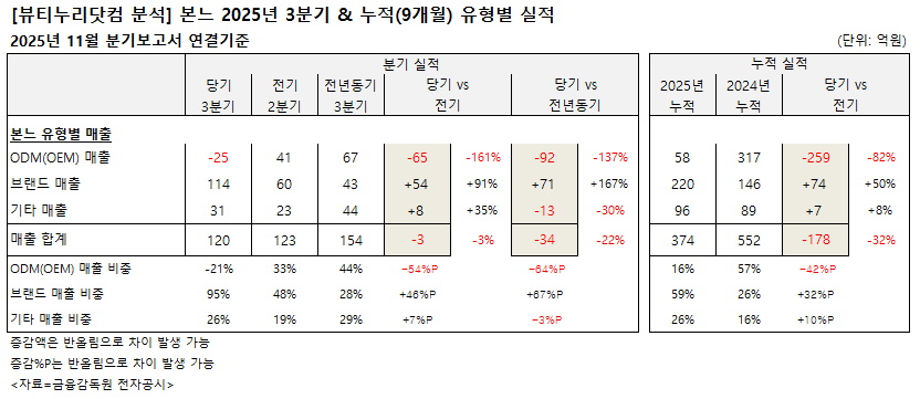 브랜드 부문의 3분기 매출은 114억원으로 전기 60억원 대비 91%, 전년동기 43억원 대비 167% 각각 급증했다. 비중은 전기 48%, 전년동기 28%에서 95%로 확대됐다. ODM(OEM) 매출이 급감한 결과다. 3분기 누적 매출은 220억원으로 전년동기 146억원 대비 50% 성장했다. 비중은 전년동기 26%에서 59%로 커졌다.