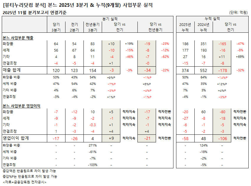 약업신문 자매지 화장품신문이 금융감독원 공시 2025년 11월 분기보고서(연결기준) 분석 결과, 본느는 올해 3분기 120억원의 매출을 기록한 것으로 나타났다. 전기 123억원 대비 2.5%, 전년동기 154억원 대비 22.1% 각각 감소했다. 17억원의 영업손실을 기록, 26억원의 영업손실을 냈던 전기 대비 손실폭은 줄였으나 적자상태가 이어지고 있다. 4억원의 영업이익을 올렸던 전년동기 대비 적자전환했다. 23억원의 순손실을 기록했다. 순손실이 발생했던 전기(-11억원) 및 전년동기(-10억원)보다 손실폭이 더 커졌다.