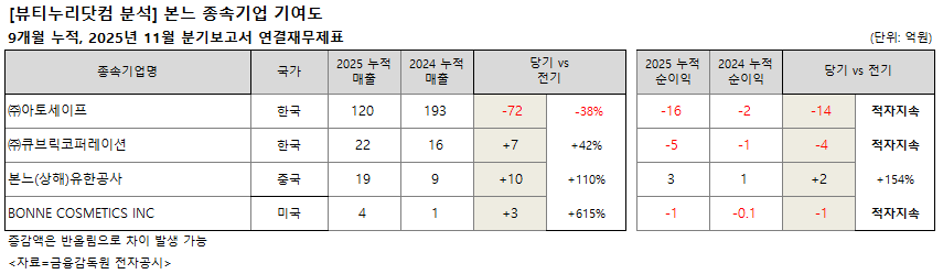 미국 소재 본느 코스메틱스㈜는 1억원의 순손실이 발생해 1000만원의 순손실이 났던 전년동기에 이어 적자상태다. 매출은 4억원으로 전년동기 1억원 대비 615% 급증했다.