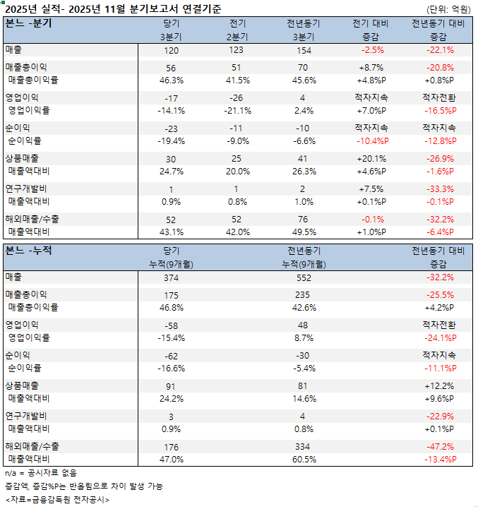 본느는 올해 3분기 매출이 감소하면서 영업손실과 순손실이 발생, 전기에 이어 적자상태다. ODM(OEM) 사업 부문의 매출 급감이 원인으로 보인다.