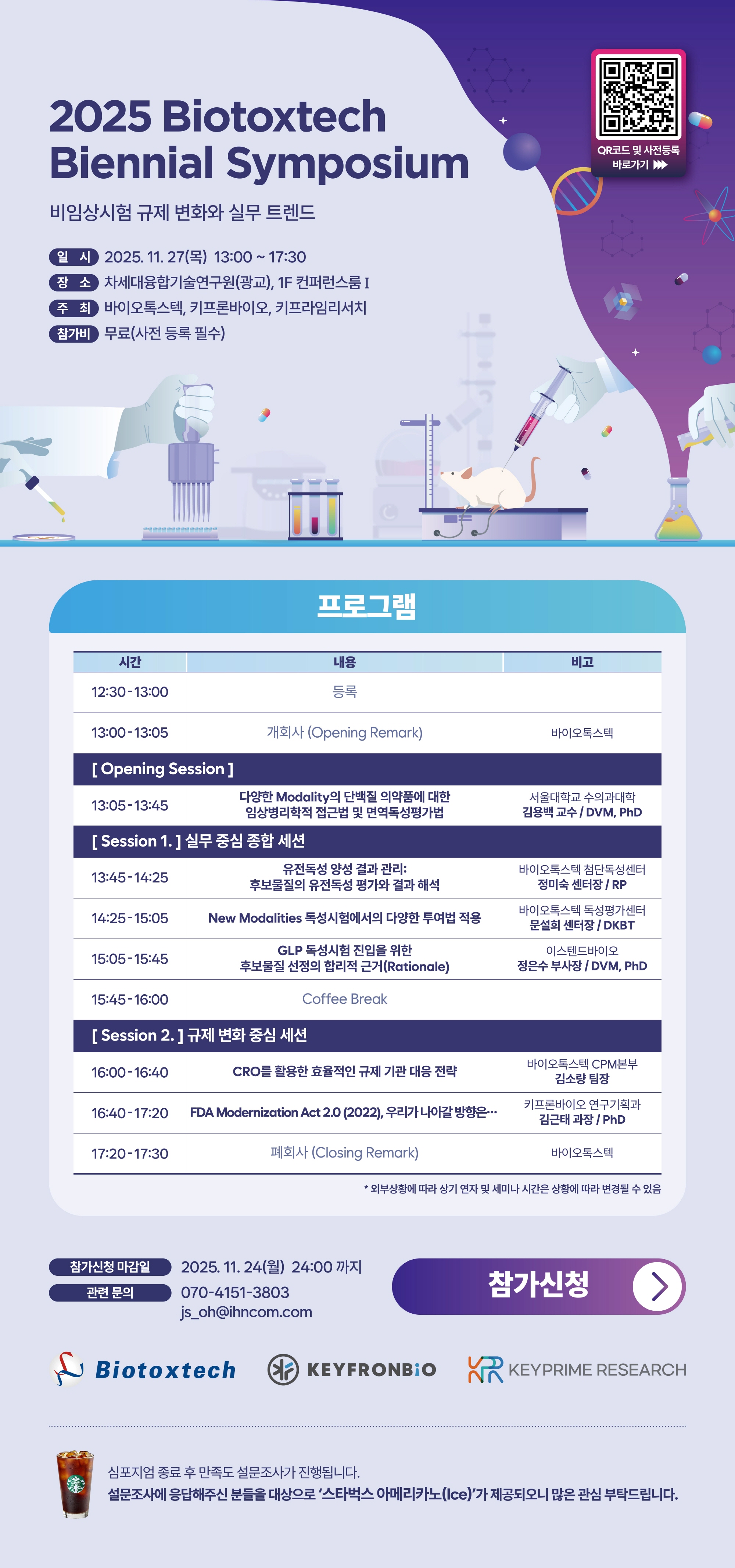이번 심포지엄은 ‘비임상시험 규제 변화와 실무 트렌드’를 주제로 최신 규제 환경과 실무 중심의 독성평가 접근법, 신기술·신 모달리티 적용 전략 등을 폭넓게 다룰 예정이다. 업계·학계·연구기관 전문가 100여명 이상이 참여해 비임상시험 전반의 현안과 미래 방향을 함께 논의하는 자리로 마련된다.