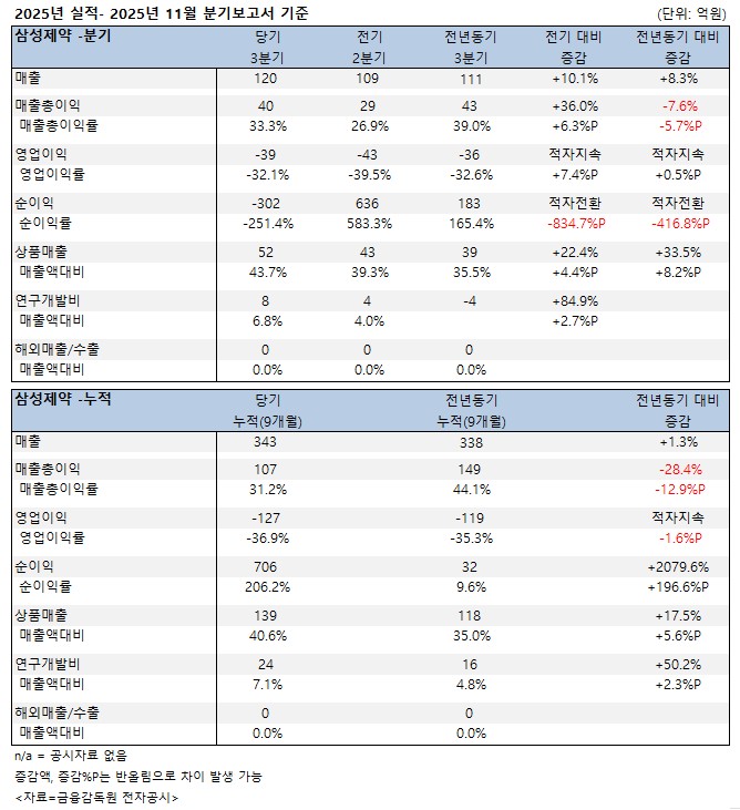 삼성제약이 2025년 3분기 전문의약품과 상품매출 확대에 힘입어 전년 대비 매출 성장세를 이어갔다.