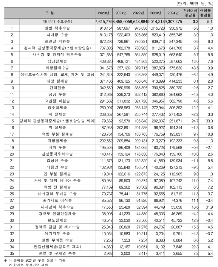내시경 및 경피적 담도수술은 연평균 증가율 10.4%로 35개 주요수술 중 가장 높은 성장세를 기록했다. 담석·담낭염 등 담도계 질환 증가와 노년층 의료 이용 확대가 주요 요인으로 꼽힌다.