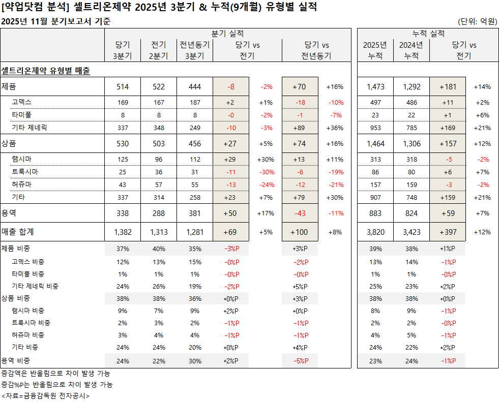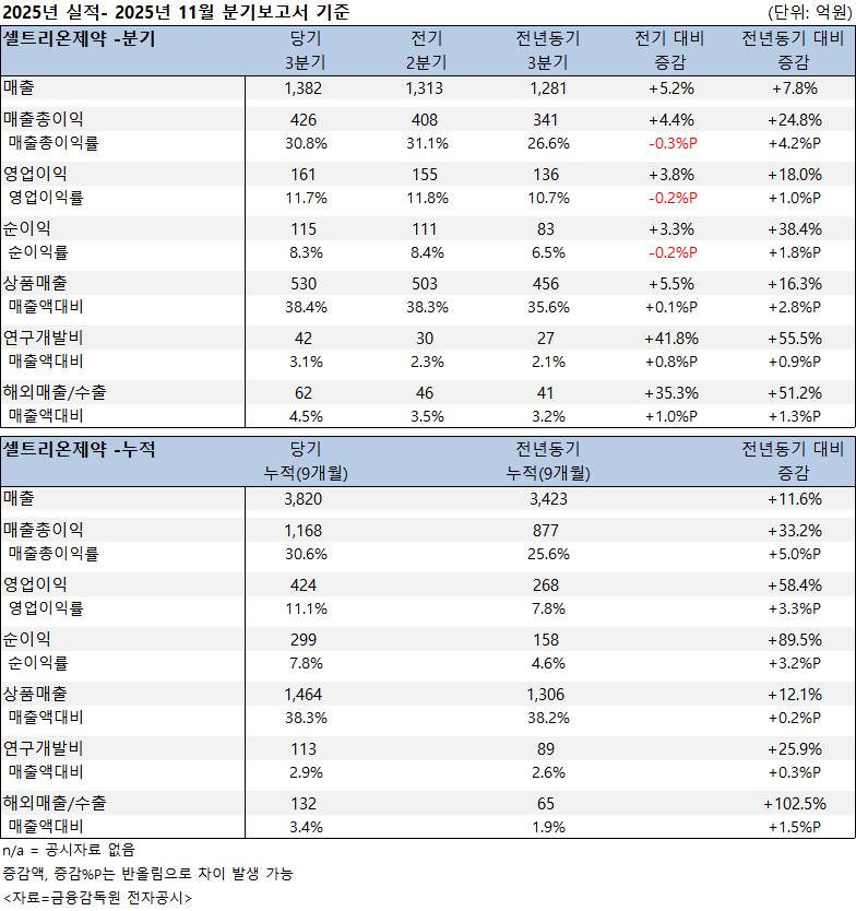 셀트리온제약은 올해 3분기까지 외형 성장과 수익성이 함께 개선되며 전반적인 재무 체력이 한 단계 더 강화된 모습이다.