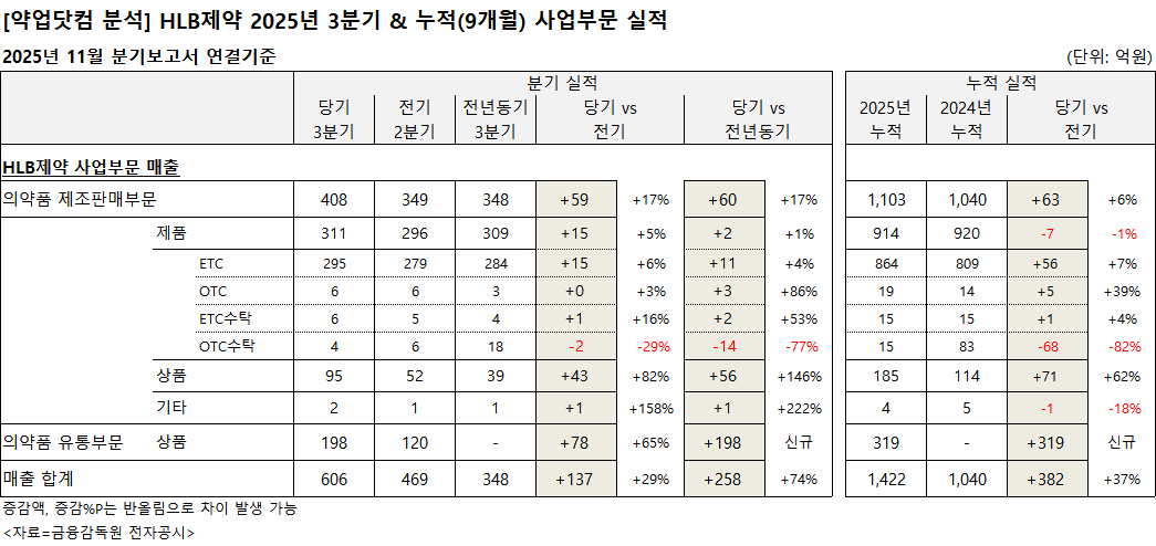 약업신문이 HLB제약의 2025년 3분기 및 누적(9개월) 실적을 분석한 결과, HLB제약은 올해 3분기까지 누적 매출 1422억원을 기록하며 전년 대비 36.7% 증가했다.