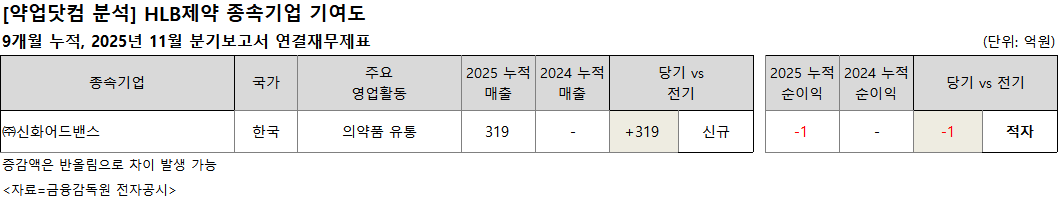 HLB제약 종속기업 신화어드밴스는 올해 3분기 누적 기준 매출 319억원을 기록하며 신규 실적이 반영됐다. 누적 순이익은 -1억원으로 집계돼 적자를 기록했다.