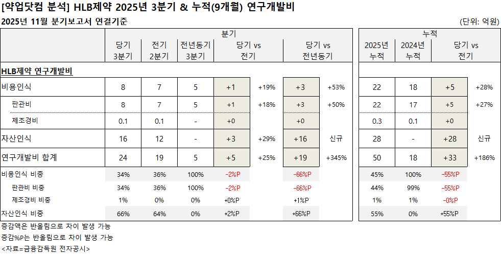 HLB제약은 올해 3분기까지 누적 연구개발비가 50억원으로 전년 18억원 대비 186% 증가했다.