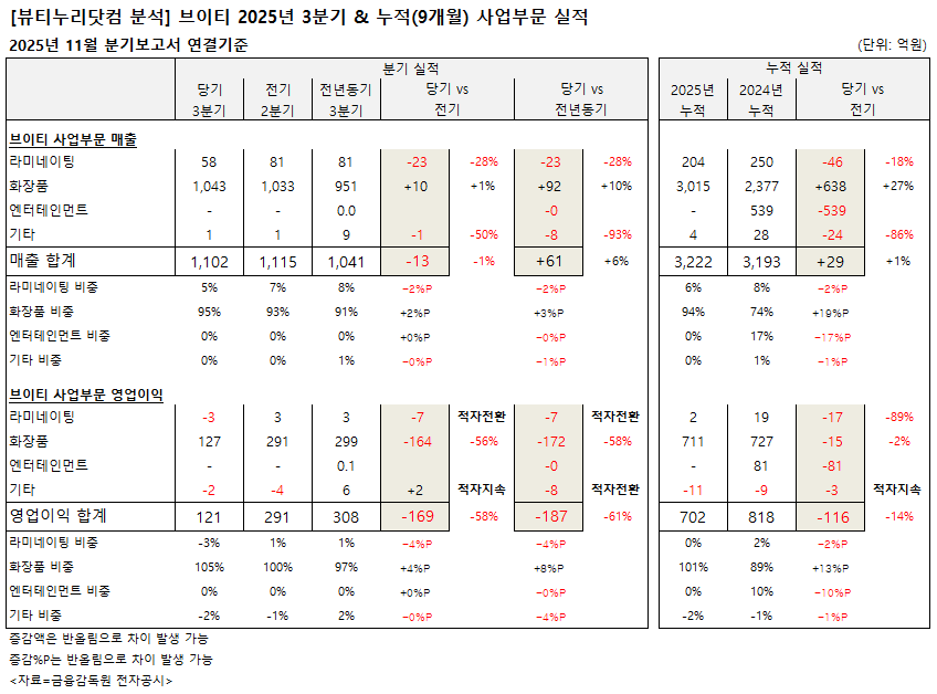 약업신문 자매지 화장품신문이 금융감독원 공시 2025년 11월 분기보고서(연결기준) 분석 결과, 브이티는 올해 3분기 1102억원의 매출을 올린 것으로 나타났다. 전기 1115억원 대비 1.2% 감소했으나, 전년동기 1041억원보다는 5.8% 증가했다. 영업이익은 121억원에 그쳐 전기 291억원 대비 58.3%, 전년동기 308억원 대비 60.7% 각각 역성장했다. 순이익도 88억에 그쳐 전기 213억원 대비 58.6%, 전년동기 333억원 대비 73.6% 각각 급감했다.