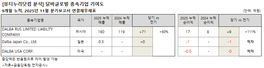 러시아의 달바 RUS LIMITED LIABILITY COMPANY의 3분기 누적 순이익은 17억원으로 전년동기 8억원 대비 111% 성장했다. 매출도 190억원을 기록, 전년동기 119억원 대비 60% 늘었다.