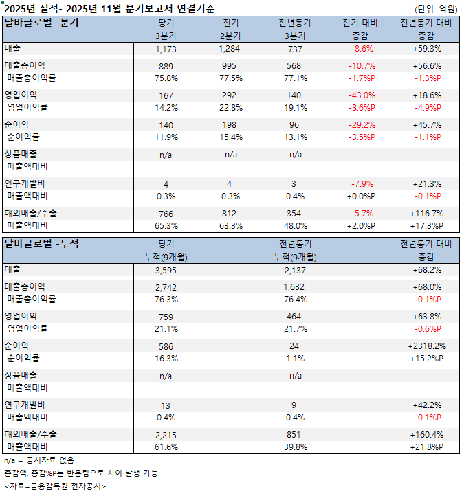 달바글로벌은 올해 3분기 전기 대비 매출·영업이익·순이익이 모두 감소했다. 그러나 전년동기보다는 여전히 실적이 수직 성장하고 있어 잠시 숨 고르기에 들어간 것으로 보인다.