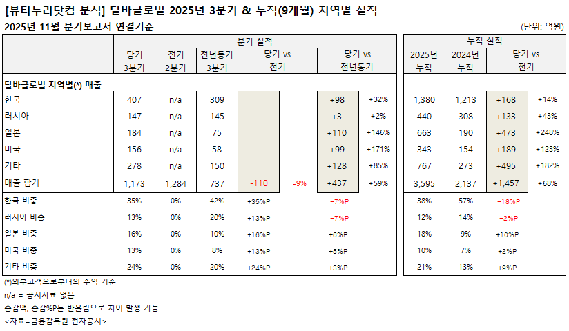 러시아 지역의 3분기 매출은 147억원으로, 전년동기 145억원 대비 2% 늘었다. 비중은 13%. 3분기 누적 매출은 440억원으로, 전년동기 308억원 대비 43% 증가했다. 비중은 12%.