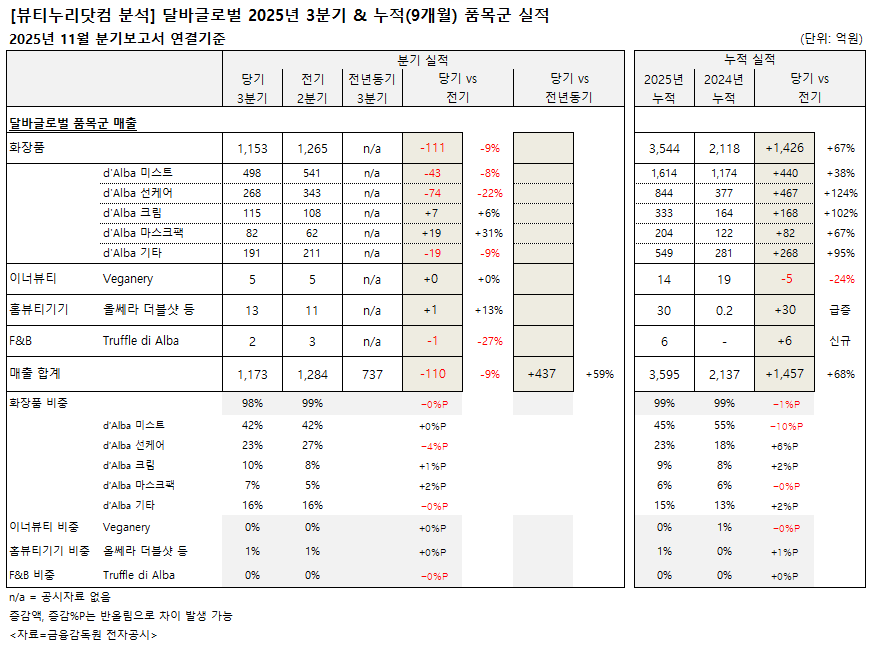 약업신문 자매지 화장품신문이 금융감독원 공시 2025년 11월 분기보고서(연결기준) 분석 결과, 달바글로벌은 올해 3분기 1173억원의 매출을 올린 것으로 나타났다. 전기 1284억원 대비 8.6% 감소했으나, 전년동기 737억원보다는 59.3% 증가했다. 영업이익은 167억원을 거둬들였다. 전기 292억원 대비 43.0% 줄었으나, 전년동기 140억원보다는 18.6% 늘었다. 순이익은 140억원을 올렸다. 전기 198억원 대비 29.2% 감소했으나 전년동기 96억원보다는 45.7% 증가했다.