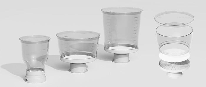세균제거용 MF (Microfiltration) 제품은 PES 멤브레인을 주요 소재로 다루며, 0.2, 0.45, 1.0 um까지 다양한 기공을 만들 수 있다. 이러한 MF 멤브레인을 이용해 실험용 보틀탑 필터, Venrich 그리고 생산용 카트리지 필터를 개발하고 생산하고 있다.