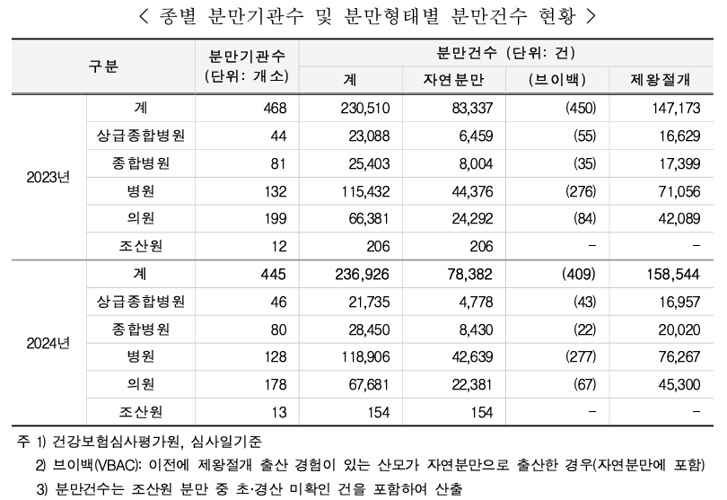 저출생이 심화되는 가운데 지난해 제왕절개 분만은 7.7% 증가한 반면 자연분만은 6% 감소했고, 분만기관 수는 468곳에서 445곳으로 4.9% 줄었다.