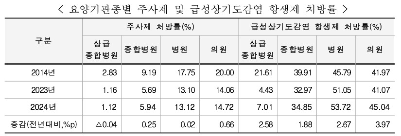 의원급 급성상기도감염 항생제 처방률은 약 41.1%에서 약 45%로 4%p 가까이 상승했고, 주사제 처방률 역시 약 14.7%로 증가했다.