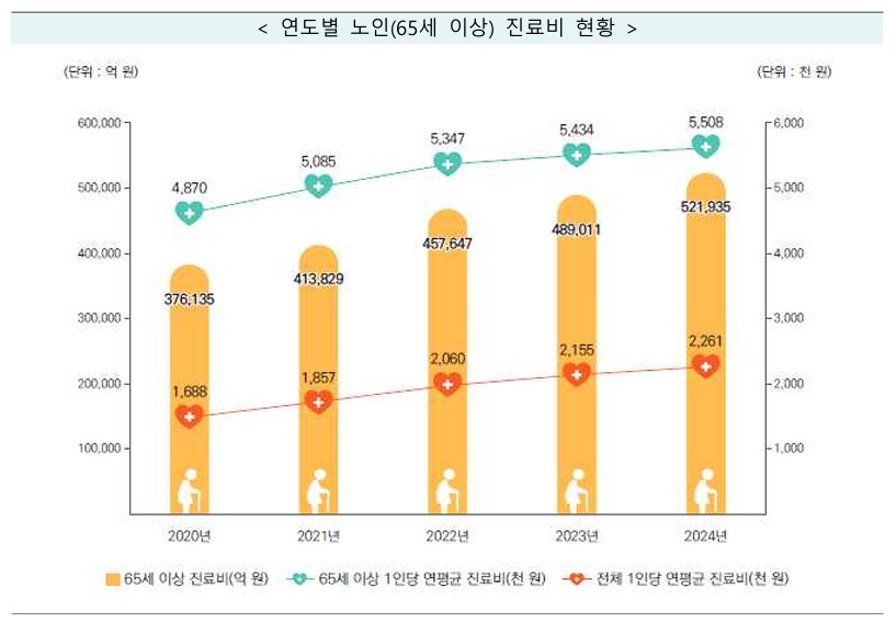 2024년 노인(65세 이상) 진료비는 52조 1935억 원으로 전년 대비 6.7% 증가해 전체 진료비 증가율(4.9%)을 크게 웃돌았다.