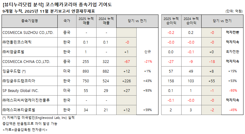 한국 소재 ㈜엔돌핀코스메틱과 ㈜에스피씨씨엠케이진천물류 등 2개사도 전년동기에 이어 적자 상태다.