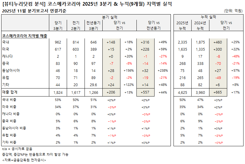 코스메카코리아는 올해 3분기 전기 및 전년동기 대비 실적이 큰폭으로 성장했다. 특히 순이익은 전기 전년동기 대비 2배 이상 급증했다. 지역별로는 국내와 미국 시장은 성장했으나 중국과 유럽 시장에선 매출이 감소했다.