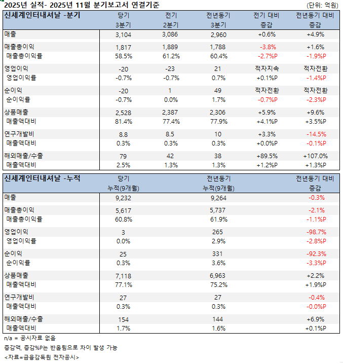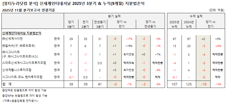 신세게인터내셔날은 3분기 38억원의 지분법이익(이하 이익)을 기록해 전기 39억원 대비 1%, 전년동기 41억원 대비 6% 각각 감소했다. 3분기 누적 이익은 107억원으로, 전년동기 125억원 대비 14% 감소했다.