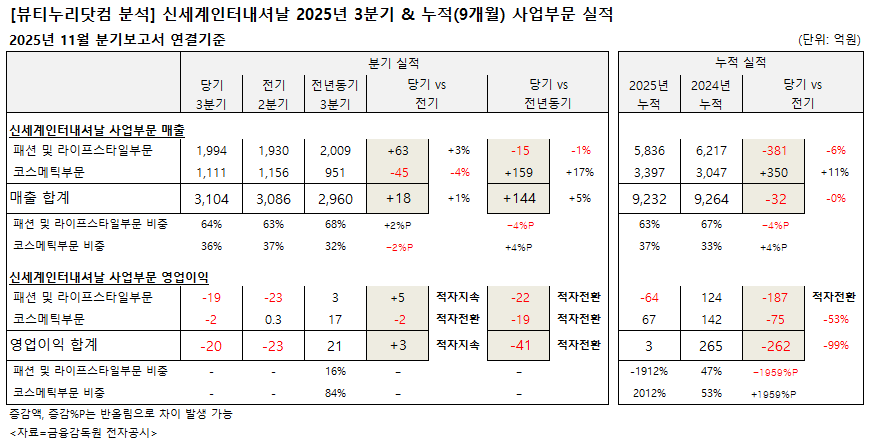 사업부문별로는 화장품과 패션및 라이프스타일 부문 모두 3분기 영업손실이 발생하면서 적자상태다.