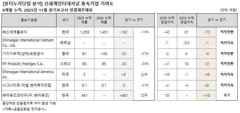 국내 소재 ㈜신세계톰보이도 40억원의 영업손실을 기록해 31억원의 영업이익을 올렸던 전년동기 대비 적자전환했다. 매출도 1259억원으로 전년동기 1451억원 대비 13% 감소했다.