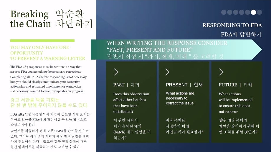 인스펙션 중에는 ‘위험 신호를 읽는 능력’이 필요하다고도 했다. 특정 이슈에 대한 논의가 유난히 길어지거나 같은 자료를 반복해서 요구하는 상황은 폼 483에 올라갈 수 있다는 시그널로 해석해야 한다. 이런 낌새가 보이면 시설 내부에 대응팀을 꾸려 관련 데이터를 신속히 취합하고, 인스펙션이 끝나기 전까지 긴급 시정조치를 진행해 폼 483에 기재될 수 있는 관찰사항의 수와 중대성을 줄이는 전략이 필요하다고 강조했다.