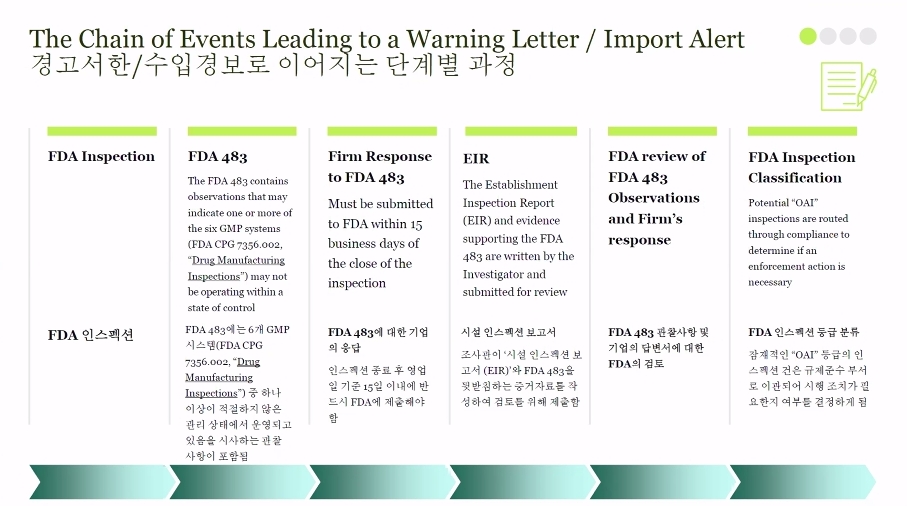 문제는 OAI 등급이다. OAI 판정이 내려지는 순간, 준법감시국은 경고서한(Warning Letter)과 수입 경보(Import Alert) 등 공식 조치를 검토한다. 한번 분류되고 나면 기업이 상황을 되돌리기가 쉽지 않다는 것이다.