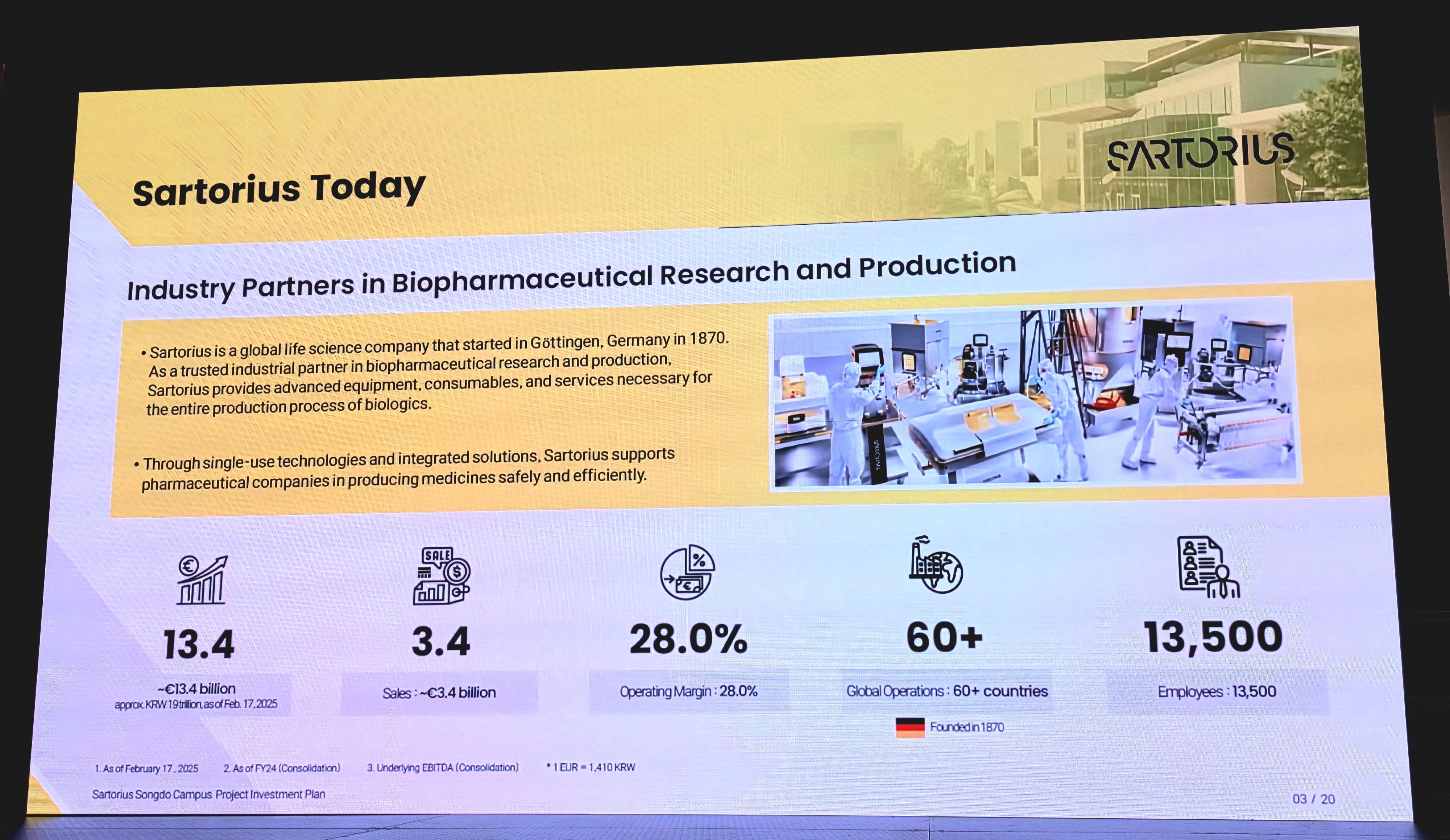 바이오 소재·부품·장비 선도기업 독일 싸토리우스(Sartorius)가 8000억원 규모의 송도 투자를 추진한 배경에 산업계 관심이 쏠리고 있다. 글로벌 리딩 기업이 미국과 중국이라는 전통적 선택지를 두고 한국을 택한 것은 단순한 입지 매력 이상의 의미가 있다는 평가가 나온다.