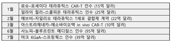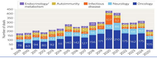 그러나 상위 치료 영역(종양학·신경학·전염병·자가면역·내분비/대사)은 여전히 123억 달러 규모 가치를 기록하며 최근 3년과 비슷한 수준을 유지했다.