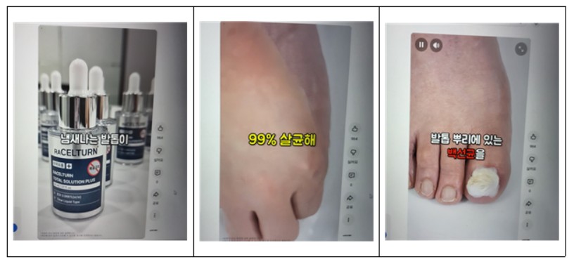 특히 광고 내용 중 ‘발톱뿌리에 있는 백선균을’, ‘99% 살균해’ 등과 같은 문구는 소비자에게 질병 치료 효과가 있는 의약품으로 오해를 유발할 소지가 높다고 지적했다.