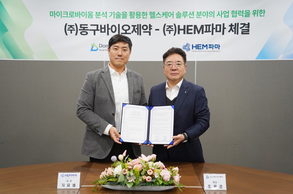 이번 협약은 양사가 보유한 기술 및 데이터 역량을 바탕으로 마이크로바이옴 기술을 다양한 영역에 적용하기 위한 협력 프레임워크를 마련하고, 중장기적 협력 방향을 검토하기 위한 목적으로 추진됐다. HEM파마는 마이크로바이옴 분석 기술과 데이터 기반 연구 역량을, 동구바이오제약은 제약 및 헬스케어 산업 전반에 걸친 전문성과 사업 경험을 보유하고 있다.
