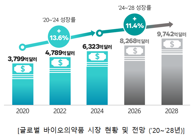 보고서에 따르면 2024년 글로벌 바이오의약품 시장은 6,323억 달러를 기록하며 연평균 13.6% 성장했으며, 2028년에는 9,742억 달러에 이를 것으로 전망된다. 미국, 독일, 프랑스 등의 국가들이 강세를 보였으며, 특히 미국 시장이 글로벌 바이오의약품 시장에서 약 65%로 가장 높은 비중을 차지했다.