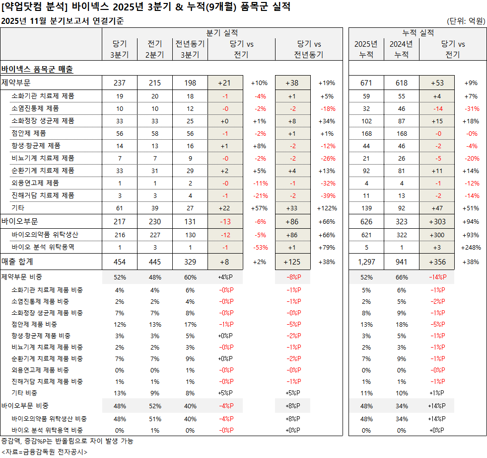 바이넥스는 2025년 11월 분기보고서(연결 기준)에서 누적 매출 1297억원을 기록해 전년 동기 대비 38% 증가했다고 밝혔다. 제약부문 매출은 648억원으로 5% 늘었고, 바이오부문 매출은 648억원으로 전년 대비 101% 급증했다. 이에 따라 매출 비중은 제약부문 50%, 바이오부문 50%로 재편됐다.