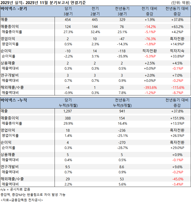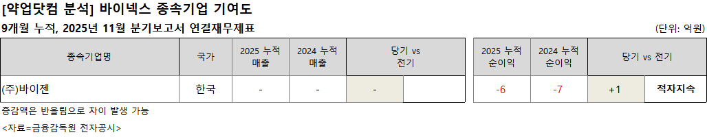 바이넥스의 국내 종속기업 ㈜바이젠은 2025년 누적 기준 매출 실적이 발생하지 않았으며, 순이익은 –6억원을 기록했다. 이는 전년 동기 순손실 –7억원 대비 손실 폭이 1억원 축소된 수치다.