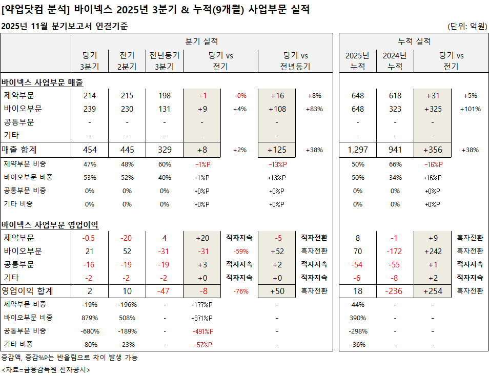 영업이익은 누적 18억원으로, 전년 동기 236억원 적자에서 흑자 전환했다. 바이오부문 영업이익이 70억원으로 전년 대비 242억원 개선되며 실적 반등을 주도했고, 제약부문도 8억원으로 흑자 전환했다. 반면 공통부문(-54억원)과 기타(-6억원)는 적자를 지속했다.