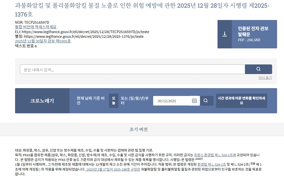프랑스 정부는 올해 1월 1일부터 PFAS를 함유한 화장품, 스키 왁스, 의류용 섬유, 신발, 해당 제품용 방수제(agents imperméabilisants)의 제조, 수입, 수출, 시장 출시를 금지하기로 했다. 이는 지난해 2월 27일 제정되고 3월 1일 발효된 'PFAS로 인한 위험으로부터 인구를 보호하기 위한 법률(loi n°2025-188)'에서 정한 시행일이다.