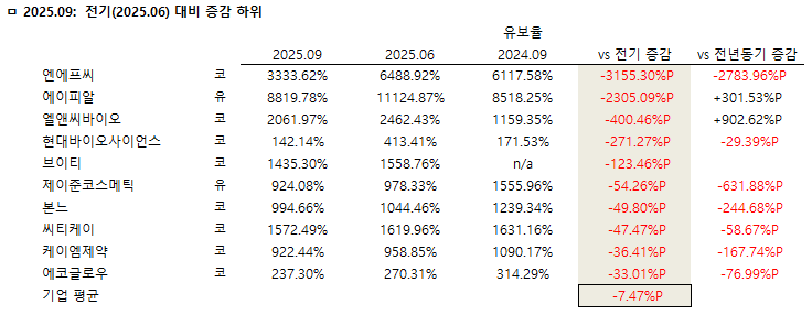 ◇ 2025년 3분기 누적 유보율 전년대비 증가율 하위 10개사