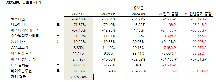 2025년 3분기 누적 기준 유보율이 가장 낮은 기업은 코스나인이다. -89.40%로, 전기 대비 2.56%p, 전년동기 대비 35.19%p 떨어졌다.