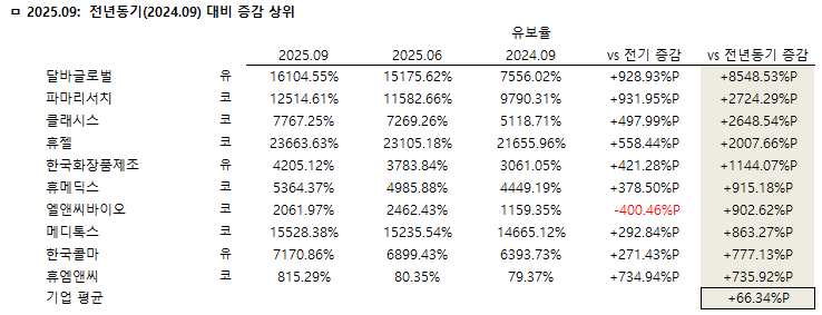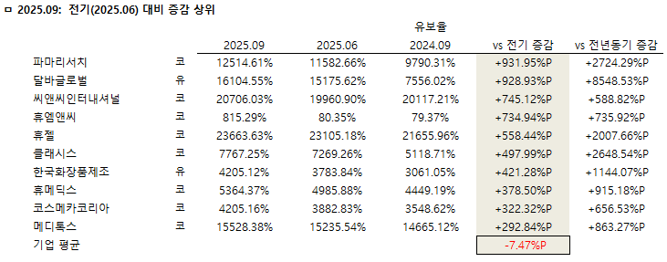 ◇ 2025년 3분기 누적 유보율 전기 대비 증가율 상위 10개사