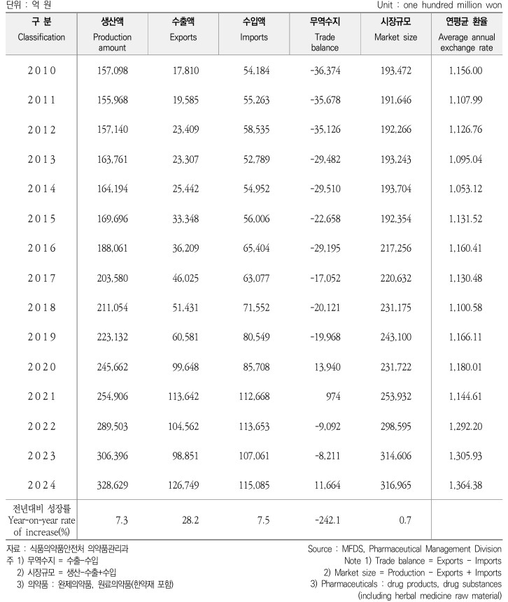 최근 식품의약품안전처가 발간한 ‘2025 식품의약품통계연보’에 따르면, 2024년 국내 의약품 생산액은 32조 8,629억원으로 전년 대비 7.3% 증가했다. 수출액은 12조 6,749억원으로 28.2% 늘었고, 수입액은 11조 5,085억원으로 집계됐다. 이에 따라 의약품 무역수지는 1조 1,664억원 흑자를 기록했으며, 시장규모는 31조 6,965억원으로 나타났다.