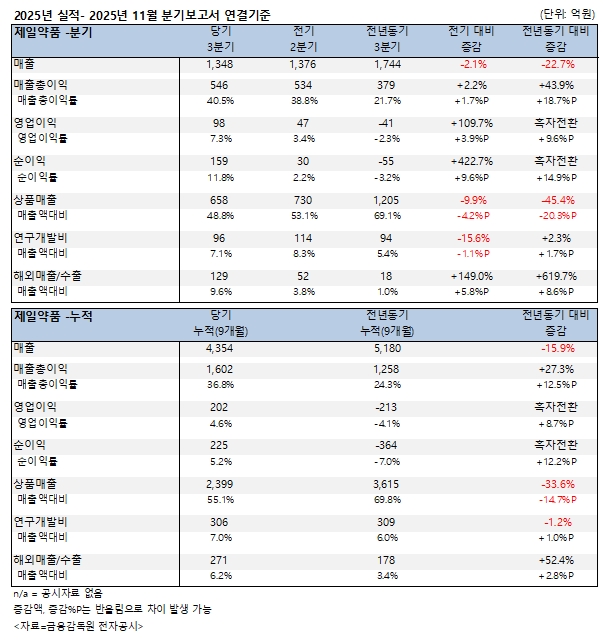 결과적으로 2024년 70%대의 상품 매출 비중이 지속적으로 감소하면서 전반적인 수익성 개선에 기여하고 있다. 특히 2025년 3분기에는 상품 매출 비중이 50% 미만으로(49%) 내려가며 제일약품 사업구조 경영에 있어 유의미한 지표를 달성했다.