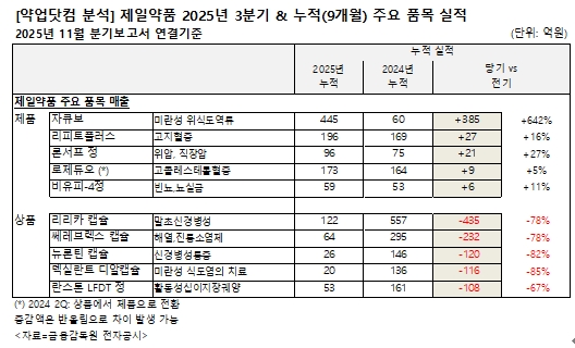 2025년 3분기 누적 제품 매출은 전년 대비 347억원 증가했다. 품목별로 신약 자큐보가 385억원 기여했다. 자큐보는 위궤양 적응증 급여 확대와 구강붕해정(ODT) 제형 출시가 이어지면서 제일약품 제품 매출 기여도가 한층 더 높아질 것으로 예상된다.