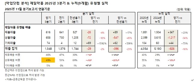 2025년 3분기 누적 상품 매출은 전년 보다 1217억원 감소했다. 품목별로 리리카가 435억원 감소하며 가장 큰 폭으로 하락했다. 이어 쎄레브렉스(-232억원), 뉴론틴(-120억원), 덱실란트(-116억원), 란스톤(-108억원)이 전체 상품 매출 감소에 기여했다.