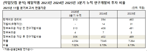 연결회계 기준으로 지배기업인 제일약품은 2025년 3분기 누적 245억원, 그리고 종속기업 온코닉테라퓨틱스는 61억원(연결조정 포함) 투자했다. 전체 투자 금액에서 80%는 지배기업, 20%는 종속기업이 차지했다.