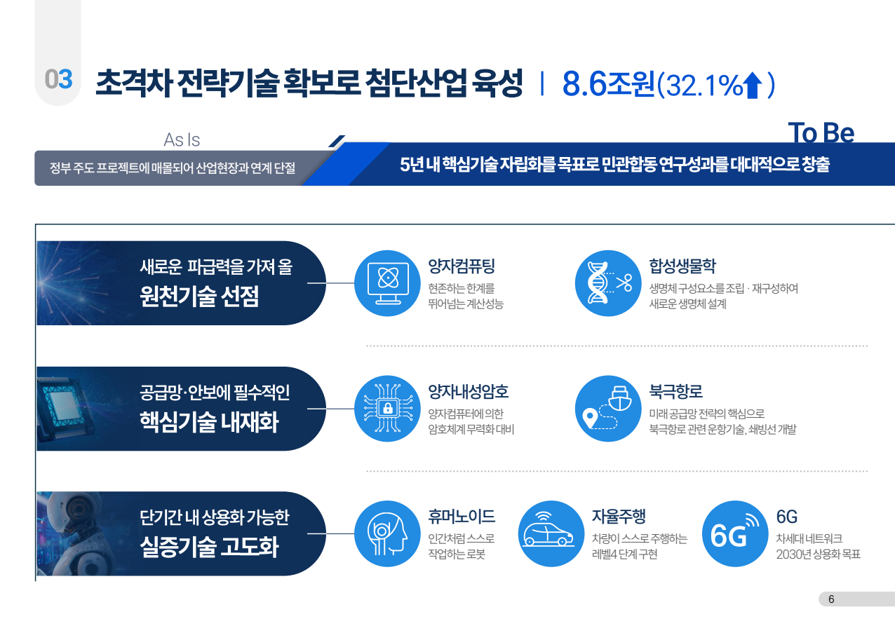 초격차 전략기술 분야에는 8조6000억원이 투입된다. 합성생물학, 첨단 바이오 원천기술, 공급망·안보 핵심 기술, 단기간 상용화가 가능한 실전 기술이 주요 대상이다. 박 과장은 “원천기술 선점과 핵심기술 내재화, 실전기술 고도화를 동시에 추진하겠다”고 말했다. 이는 단기 성과 중심 과제에서 벗어나 중장기 기술 주권을 확보하겠다는 신호로 해석된다.