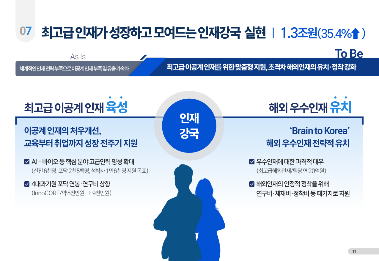 인재와 출연연 구조 개편도 병행된다. 인재 양성·유치에는 1조3000억원이 투입되며, 출연연에는 4조원이 배정됐다. 연구자가 인건비 부담 없이 연구에 몰두할 수 있도록 PBS(Project-Based System)는 2030년까지 단계적으로 폐지된다. PBS는 정부출연연구기관에서 연구자의 인건비 상당 부분을 개별 연구과제 수주 성과에 연동해 지급하는 제도다. 과제 확보 부담이 연구자에게 전가되고 단기 및 성과 중심 연구를 유도한다는 비판이 제기돼 왔다.