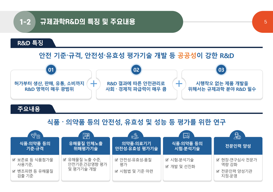 연구 내용 역시 안전성·유효성·성능 평가를 위한 기술 개발을 중심으로 ▲기준·규격 연구 ▲유해물질 인체 노출 및 위해 평가 ▲의약품·의료기기 안전성·유효성 평가 기술 ▲시험·분석 기술 ▲규제 전문 인력 양성 등으로 구분된다.
