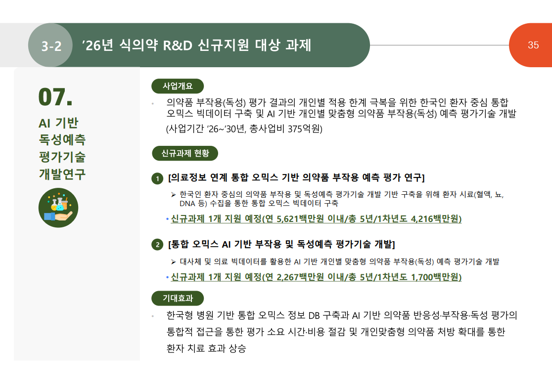 마지막 일곱 번째 신규 사업은 ‘AI 기반 독성 예측 평가 기술 개발 연구’다. 이 사업은 한국인 환자 중심의 통합 오믹스 빅데이터를 구축하고, 이를 활용해 개인 맞춤형 의약품 부작용 예측 기술을 개발하는 데 목적이 있다.