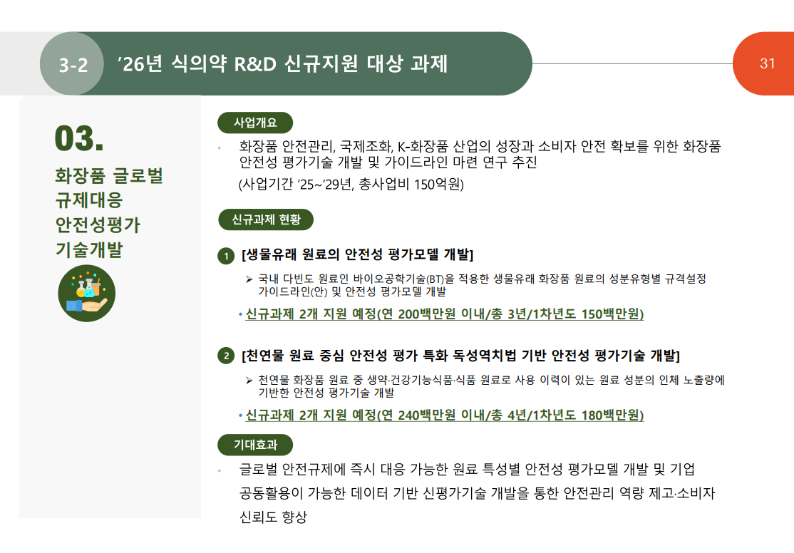 세 번째 신규 사업은 ‘화장품 글로벌 규제 대응 안전성 평가 기술 개발 사업’이다. 이 사업은 화장품 안전성 평가 기술을 고도화하고, 국내외 규제 환경에 대응할 수 있는 가이드라인을 마련하는 데 목적이 있다.