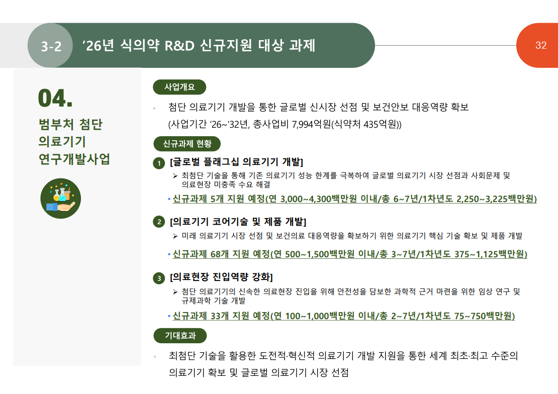 2026년에는 ▲글로벌 플래그십 의료기기 개발 5개 과제, ▲의료기기 핵심 기술 및 제품 개발 68개 과제, ▲의료 현장 진입 역량 강화 33개 과제가 지원될 예정이다. 구체적인 공고 내용은 범부처 사업단을 통해 별도로 안내된다.